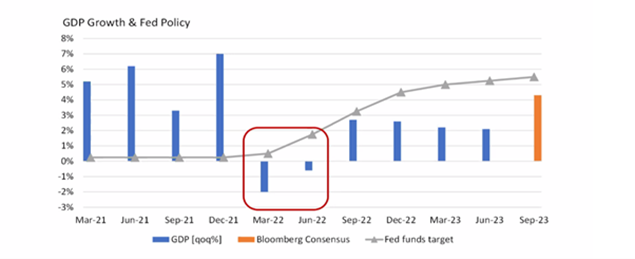 Rispetto ad alcuni trimestri fa, la view è cambiata. Oggi la Federal Reserve (Fed) si attende una crescita “molto forte” per il terzo trimestre negli Stati Uniti. Nemmeno l’ombra di una depressione dell’economia come effetto della serie di rialzi dei tassi da parte della banca centrale, per ora. Anzi, abbiamo addirittura un’economia statunitense in crescita. Forse la recessione arriverà nel 2024, o forse (è pur lecito chiederselo) la recessione c’è già stata (vedi grafico evidenziato in rosso), nella prima parte del 2022?