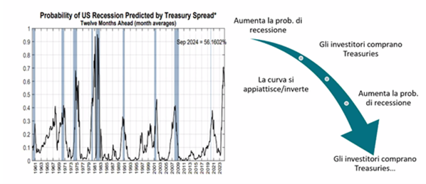 Tuttavia le stime degli analisti si basano spesso sulla ripidità della curva, ma questo è un argomento circolare. In breve, gli investitori comprano Treasuries a scadenza come mossa difensiva, temendo una recessione. Di conseguenza, la curva si appiattisce o s’inverte e con la curva invertita il modello aumenta la probabilità di recessione. Quindi gli investitori comprano ancora Treasuries.