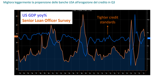 L’indicatore sull’erogazione del credito negli Stati Uniti pubblicato di recente mostra che dopo un peggioramento delle condizioni del credito nell’immediato post-Covid c’è stato, nel trimestre in corso, un leggero miglioramento, anche se gli istituti di credito tendono ancora a stringere i cordoni della borsa dei finanziamenti. La linea blu mostra la variazione del Pil americano su base annua.