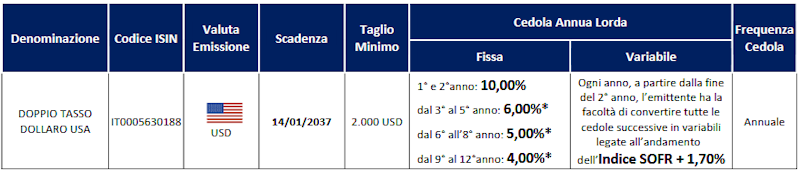 L’Obbligazione Doppio Tasso (con codice ISIN IT0005630188) ha una durata di 12 anni ed è rivolta al mercato retail, con un taglio minimo pari a 2.000 USD.