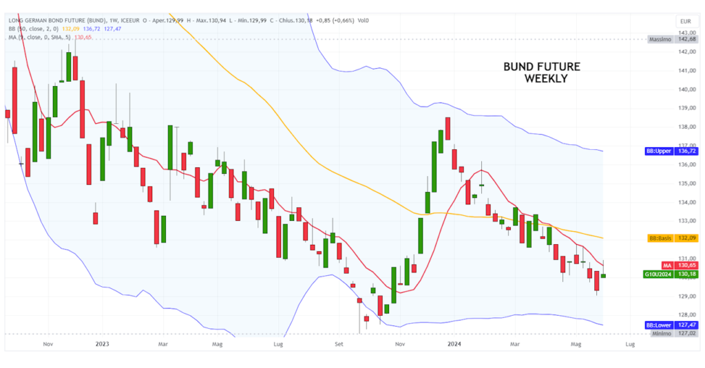 Anche la situazione tecnica del Bund future rimane precaria, con le quotazioni che si sono scontrate con la solida resistenza grafica posta in area 131,50-131,60 punti e sono scese con una certa decisione verso i 130 punti.